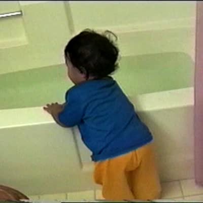Woman falls off side of the tub while giving 2 kids a bath. Baby 's privates must be blurred. *See clearance note below.