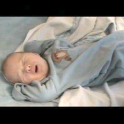 Newborn baby boy makes a sad face when mom says "bath" and gets a big smile when dad says "naked."