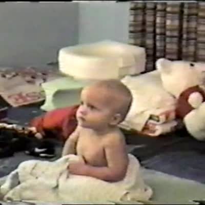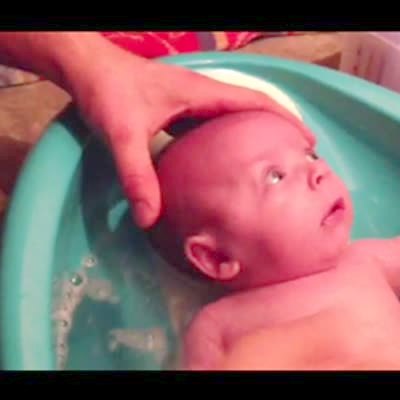 A baby boy makes funny/ surprise face at :11 when his dad sprinkles water on him during a bath.