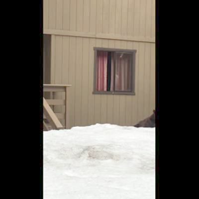 Woman films black bear from upper deck of house, bear suddenly lunges at her and growls loudly, family runs inside house. Wild Animal. Scare.