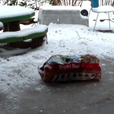 Young bear hangs from the porch roof to try and reach bird feeder. Bear eventually falls down when wood from roof breaks. Drops out of sight. No tails. Cabin, woods, forest.