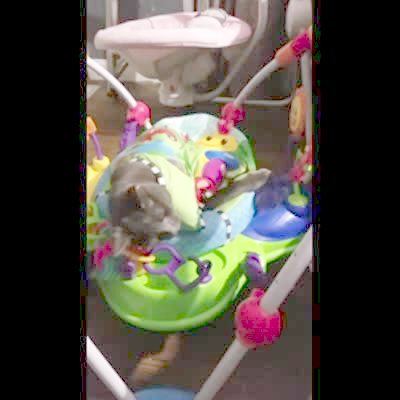 A cat jumps from underneath a baby bouncer and puts its head through a leg hole.