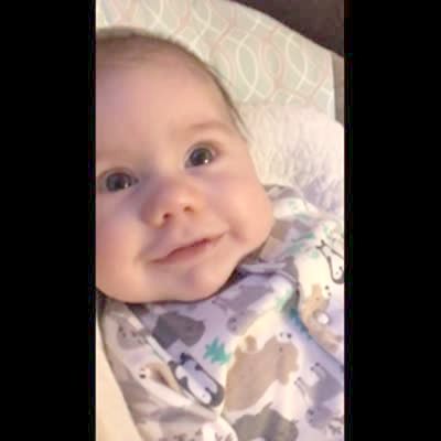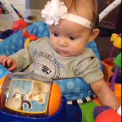 A baby looks surprised when a woman spins a toy attached to her bouncer.