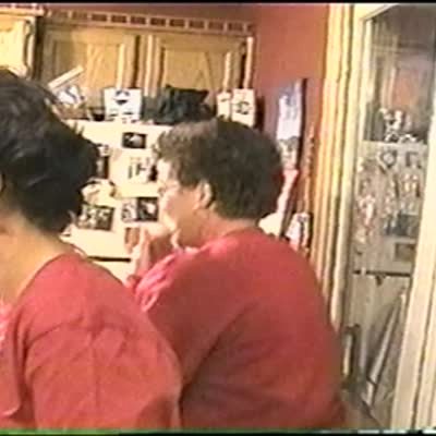 A woman films a row of Cabbage Patch dolls in the bedroom, and her baby girl sits in the center with a wig on.