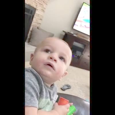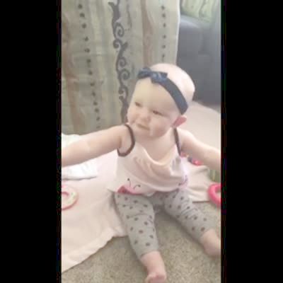 A woman does the what the fluff challenge for a baby in the bedroom and the baby makes a shocked face and looks at the camera.