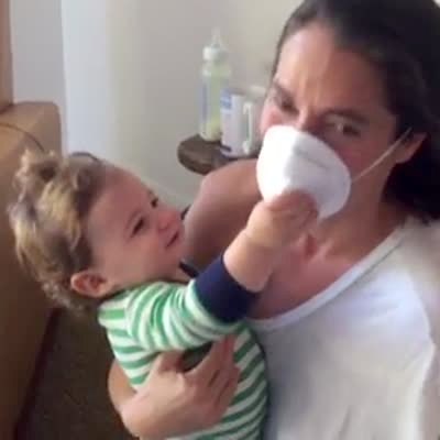 A baby girl laughs as she plays with her mom's face mask and snaps it back. A dog then takes the mask and snaps it.