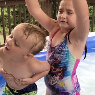 A tot boy hits his young girl sister in face with his hand while they dance together in a baby pool.