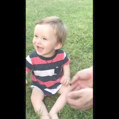 A baby boy laughs as he plays with a frog that his dad is holding and the frog jumps on to his face and head.