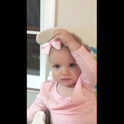 A baby girl pulls down her headband. It snaps back and hits her in the face, covering her eyes.