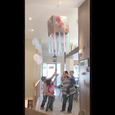 A man, woman and their son and daughter pull on a hanging box for a gender reveal, but the box falls and hits the woman in the face.