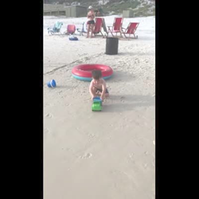 A baby boy pushes a toy truck on the beach then crashes face first into the water.