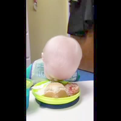 A baby boy sleeps with his face in his food and, when he lifts his head, there is ketchup in the middle of his forehead.