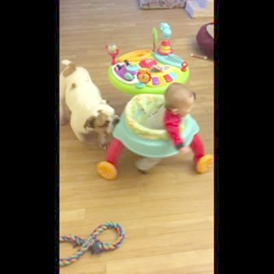 A bulldog dog pushes a baby boy in circles around a play area. A second bulldog stops the baby from moving forward and licks the baby's face.
