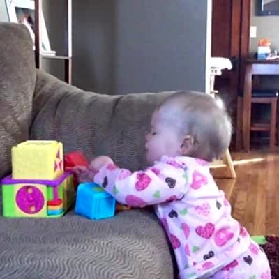 A baby girl knocks over a tower of blocks on a living room sofa and gets hit in the face before giving the camera the stink eye.