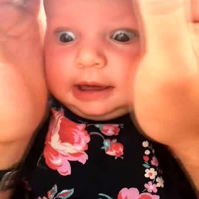 A man deflates a whoopee cushion in a baby's face. The baby makes a series of confused and surprised faces as air is blown in her face.