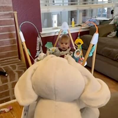 A baby boy has a startled face as he looks at a new elephant toy that speaks and says peek-a-boo, then he starts to cry.