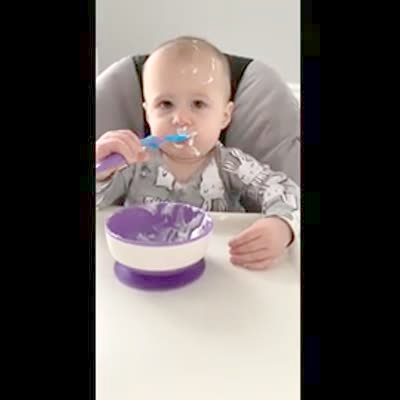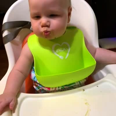 A baby girl with food all over her face eats with a spoon in a high chair, then accidentally flicks food onto her eye.