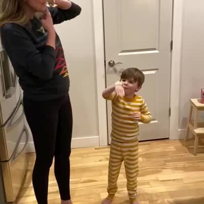 A woman does the whipped cream challenge in a kitchen and catches it in her mouth. She tries to help a young boy do it and she flicks his arm and the whipped cream flies into the air and lands on a baby boy's face.