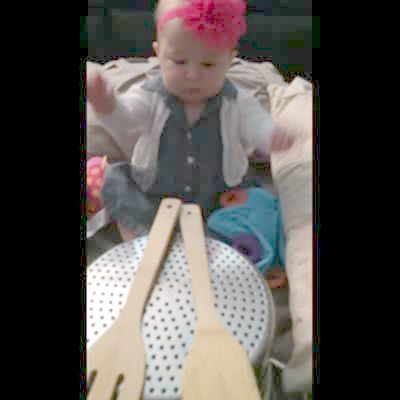 A baby girl smacks two spatulas resting on a pot pan and they smack her in the face and she makes a surprised face then starts crying.