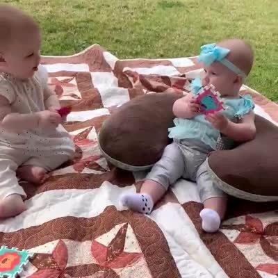 A baby girl tries to take a plastic toy from a baby girl and when she can't she pulls on the girl's bow to make it hit her face. No sound.