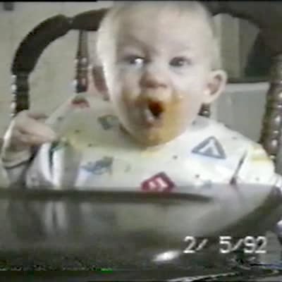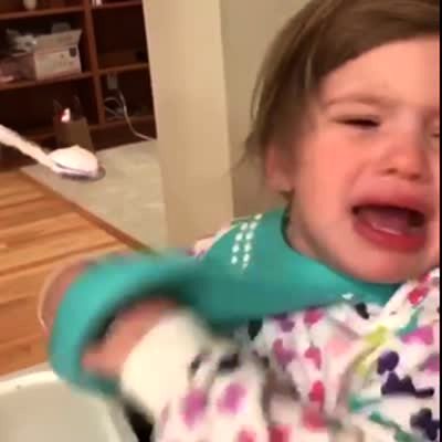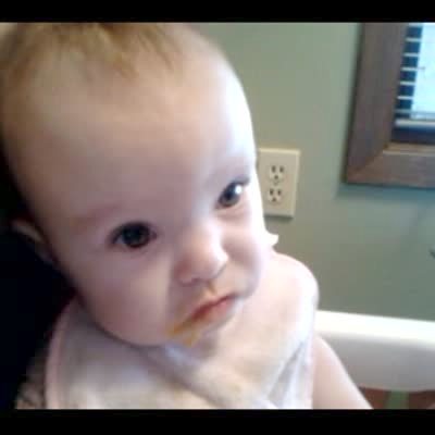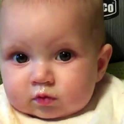 Dad makes weird sound effects off screen when baby opens mouth - it looks like baby is screaming for food. eating, first foods