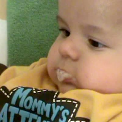 A baby boy gets a piece of food stuck in his upper lip, which makes it look as if he has Buck Teeth.