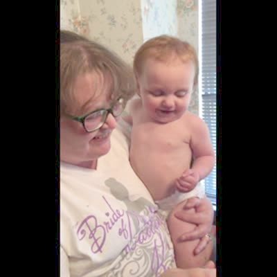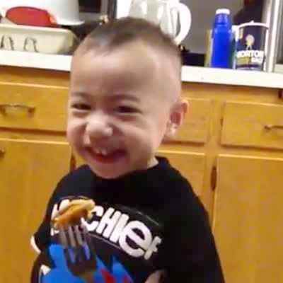 "Magic Trick Tot" A woman tells a tot boy to put a piece of paper in her fist in a kitchen. She shakes her hand and throws the paper over her shoulder, then laughs with the tot boy and shows him that it is gone. After a few rounds of this trick, the tot boy yells "oh my gosh."