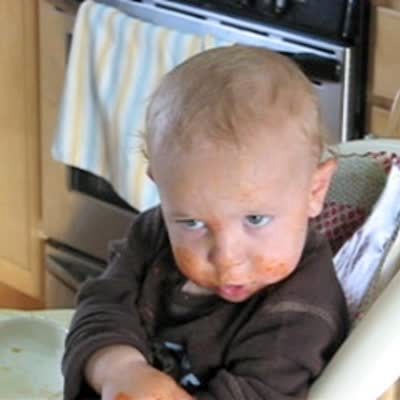 A one year old baby boy with food on his face gives camera the "stink eye."