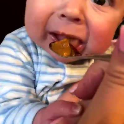 A baby boy eats a spicy mussel for the first time.