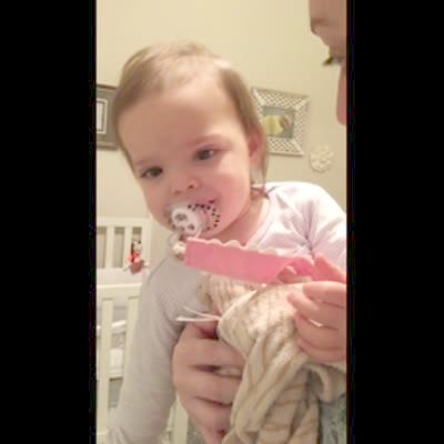 A woman asks her baby daughter to say mama. The girl says dada and laughs.