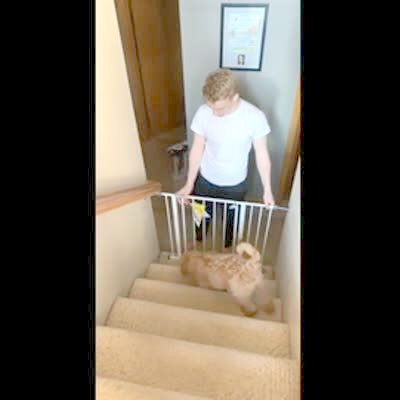 A teen boy puts a baby gate at the bottom of a staircase in a house but a puppy dog slips through the bars on the side of the gate. The boy looks surprised and laughs.