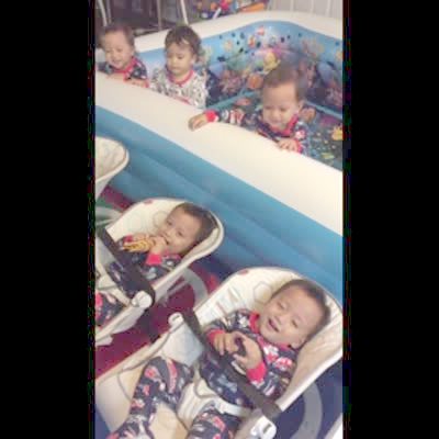 A baby girl cries into a microphone in the living room and her noises are auto-tuned and off-camera adults laugh.