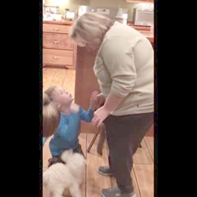 A tot girl records a video in the kitchen of how to make cupcakes. Her father holds her baby brother and moves him in and out of the frame as she talks. She laughs and giggles hysterically.