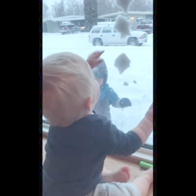 A baby boy laughs as a man and a tot boy throw snow at the window the baby boy is sitting at.