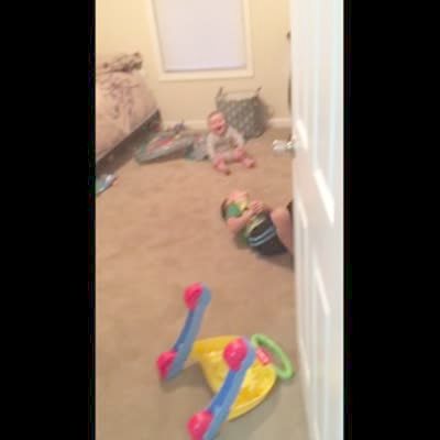 A baby boy laughs in the bedroom when his older brother pretends to trip on a toy. The boy asks his mom if this is how brother's play and then pushes the toy across the floor and it hits the baby and knocks him over.