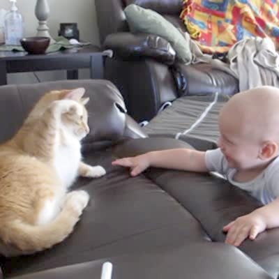 A baby boy laughs as a cat smacks him on a living room sofa.