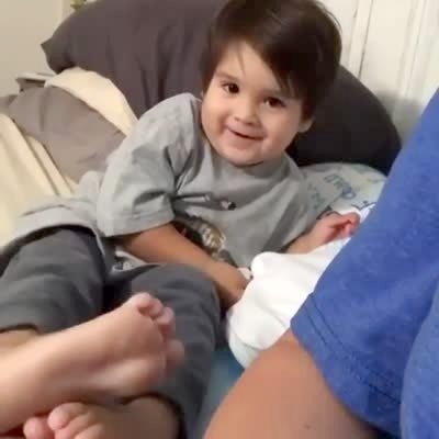A young boy meets his baby sister for the first time and makes a sour face and turns away and his parents laugh.
