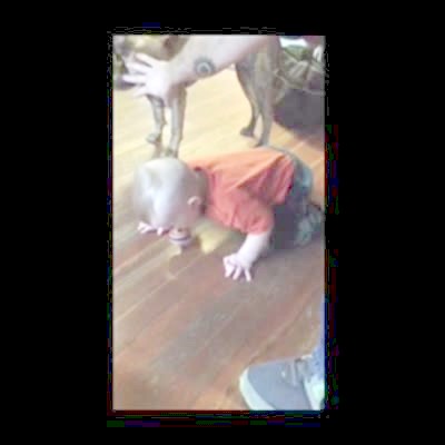 A baby girl coos in her playpen, and a dog uses its teeth to unzip the opening and walks in in the living room.