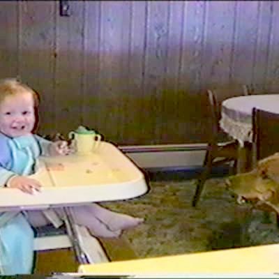Mom holds baby girl, baby laughs every time kitten jumps up out of baby's walker. Cat pops its head out from walker seat. Baby bumps her head against the walker. Cute, giggle,. silly pet tricks.