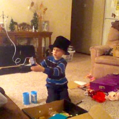 Tot boy can't find his favorite Tigger stuffed toy. He realizes Tigger has been in his arms the whole time & says "He was playing a joke on me."