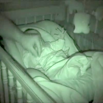 Baby boy sleeps in his crib, when dad touches one hand to put it down, the other arm goes up. Nightshot.