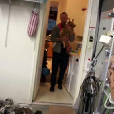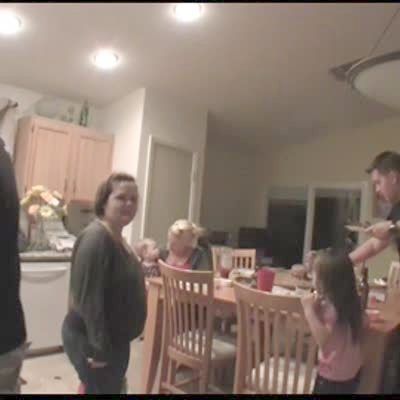 A man tricks a woman into holding a fake scary baby in a kitchen when she's expecting to hold a baby boy that's new to the family.