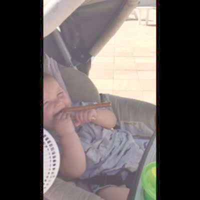 A boy makes his baby brother "disappear" by pushing him forcefully away in the baby's walker at home. Magic trick.