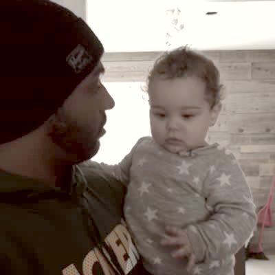 Dad balances baby on one hand. Very cool. Dad balances baby on one hand. Very cool.