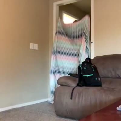 A woman does the "what the fluff" trick with her baby boy in the house. She drops the blanket and runs into the wall next to her.