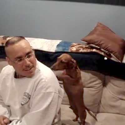Dachshund dog playfully scratches man's back on the couch. Itchy.
