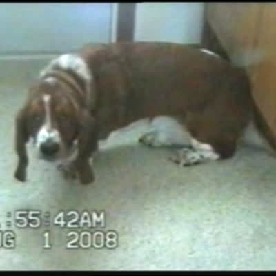 Bassett Hound dog scratches its butt on the back of an office desk & makes funny noises.