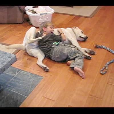 Young boy lies on a golden lab dog on the living room floor. He scratches the dog's back and the dog scratches boy's back with his hind paw.