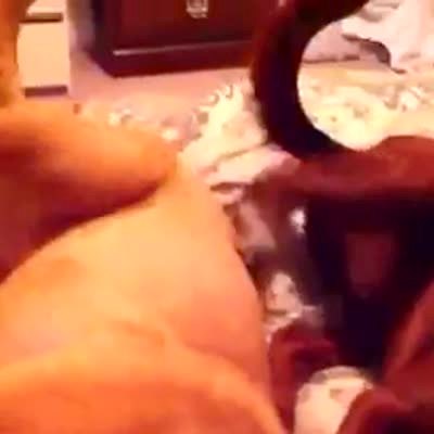 A woman pets/ scratches a brown dog on a bed and its leg twitches. Its twitching leg then scratches a tan dog's back and makes that dog's leg twitch.