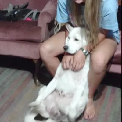 A woman scratches a dog's belly, and the dog pulls her hand back each time she stops.